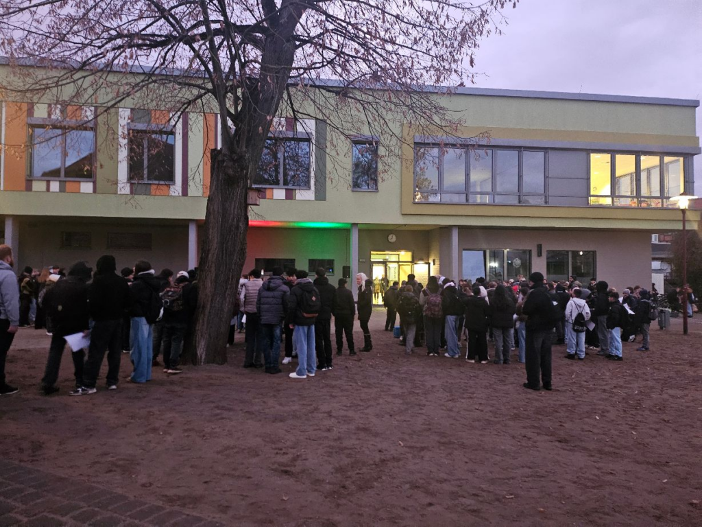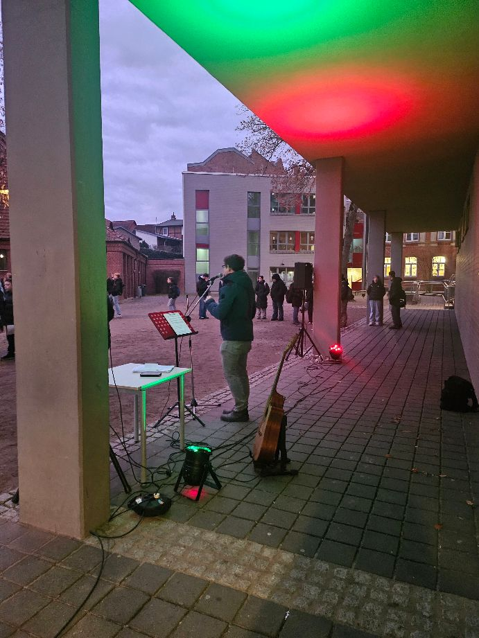 Am letzten Schultag vor den Weihnachtsferien sangen unsere Schüler*innen und Lehrer*innen gemeinsam traditionelle Weihnachtslieder auf dem Schulhof. Herr Schirrmeister moderierte den schönen Moment des Miteinanders in der Vorweihnachtszeit.